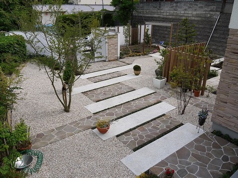 門扉を抜けて玄関までのアプローチも、自然石とコンクリートをリズム感をつけてランダムに配置しました。